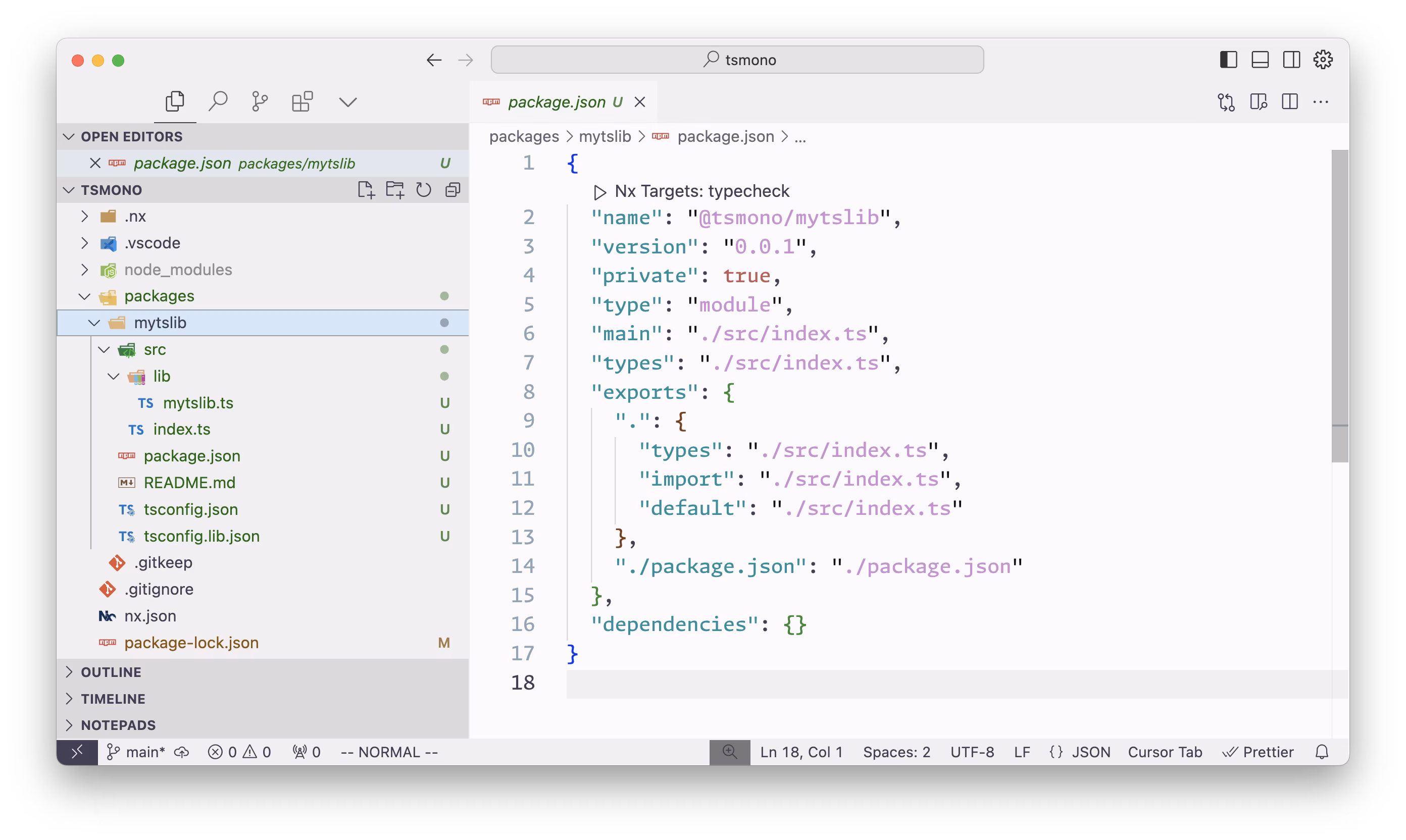 Thanks to the TypeScript project references created by Nx during project generation, your editor will fully support features like autocomplete and navigation. For instance, the root-level tsconfig.json